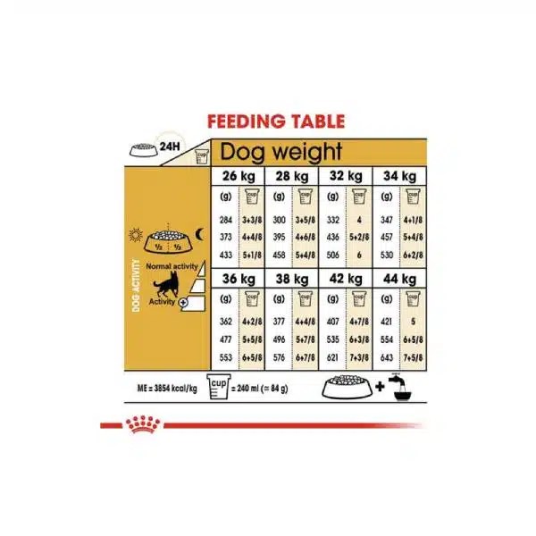 رژیم غذایی باید براساس وزن و فعالیت روزانه سگ تنظیم شود، طبق جدول پیشنهادی رویال کنین: